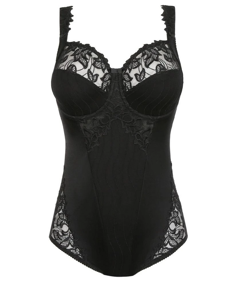 Body correcteur luxueux intégrant un soutien-gorge à armatures avec bonnet en 3 parties. Utilisation généreuse de la broderie sur le bonnet, la bretelle, à l’échancrure et sur le devant. Le bonnet résistant lifte la poitrine et le renfort latéral la centre joliment. Le renfort latéral rehaussé enveloppe davantage la poitrine et la soutient encore mieux. Par ailleurs, le bonnet est plus profond que sur tous les autres soutiens-gorge PrimaDonna, avec à la clé un effet liftant encore supérieur. L’idéal pour les fortes poitrines. Les grandes tailles de bonnet sont modelées idéalement, avec pour résultat un galbe rond et homogène.