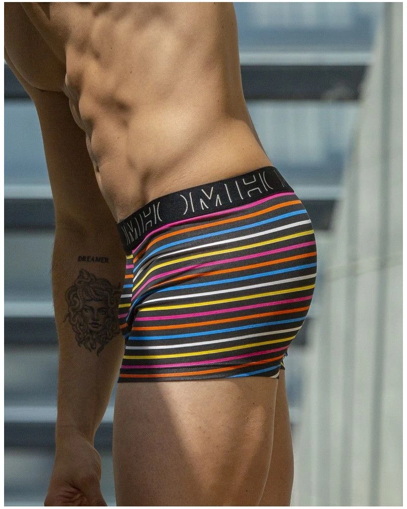 Ce Pack de deux boxers de la marque HOM est en en coton peigné stretch doux en uni et rayure imprimé colorée multicolore sur un fond noir, avec une ceinture logotypée HOM.