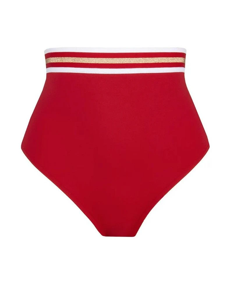 La culotte de bain Lise Charmel de la collection Energie Nautique offre une allure moderne et élégante avec son lastique graphique aux touches cuivrées souligne la taille et sa maille unie tonique certifiée Lycra Sport.