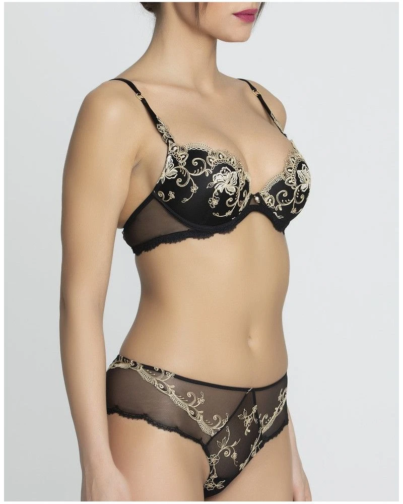 Déesse en Glam est une nouvelle collection proposée par la marque Lise Charmel. Une ligne luxueuse avec sa broderie spectaculaire qui attire le regard. C’est par l’association d’entrelacs de fleurs et de volutes que cette collection encre son style glamour. Des détails viennent magnifier ce look élégant avec des perles brodées et des diadèmes.