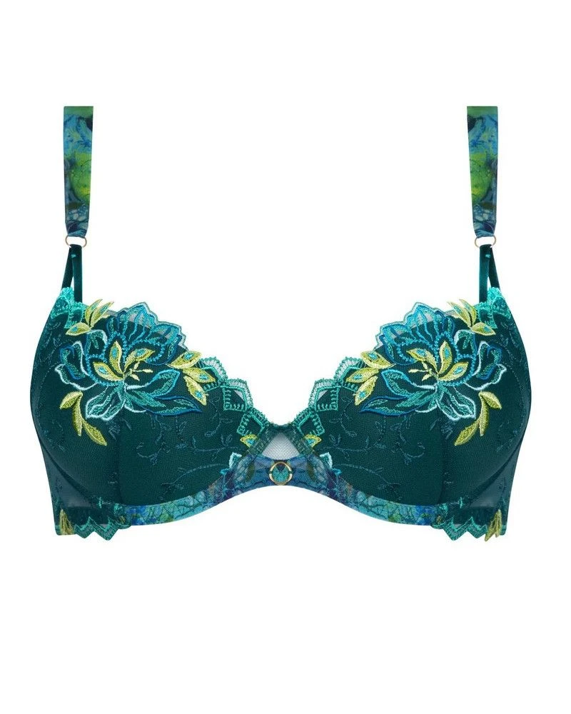 Grâce Aquatique est une nouvelle collection proposée par la marque Lise Charmel. Une ligne luxueuse avec sa broderie colorée qui attire le regard. Elle retrace le voyage de nos rêves à travers des coupes structurées associant broderie et imprimé placé.