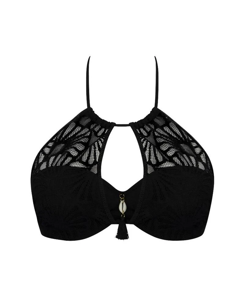 Le soutien-gorge de bain bandeau à coques de la collection La Muse Dentelle propose des bretelles amovibles et réglables ainsi qu’un lacet multiposition en tour de cou. La dentelle non doublée au décolleté dévoile la peau par transparence.