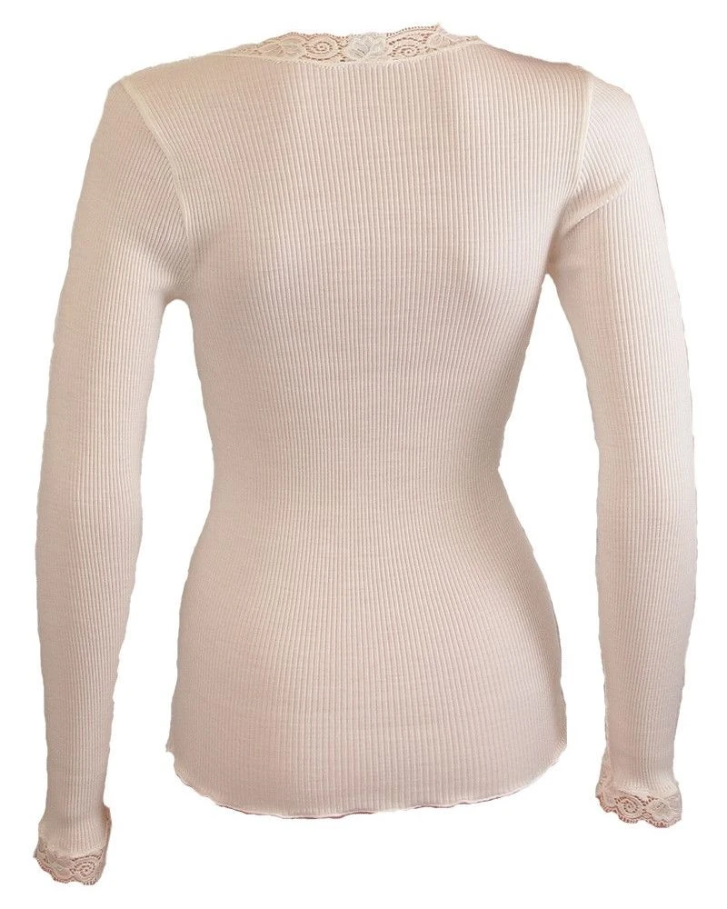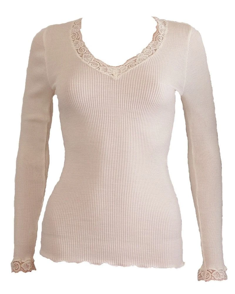 Un top à manches longues laine & soie fabriqué en Italie au décolleté orné d’une délicate dentelle Leavers pour un confort optimal et une esthétique raffinée.