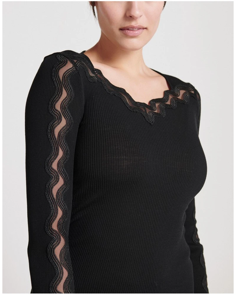 Un top à manches longues fabriqué en Italie arborant des détails fantaisies en tulle brodé pour une esthétique raffinée.